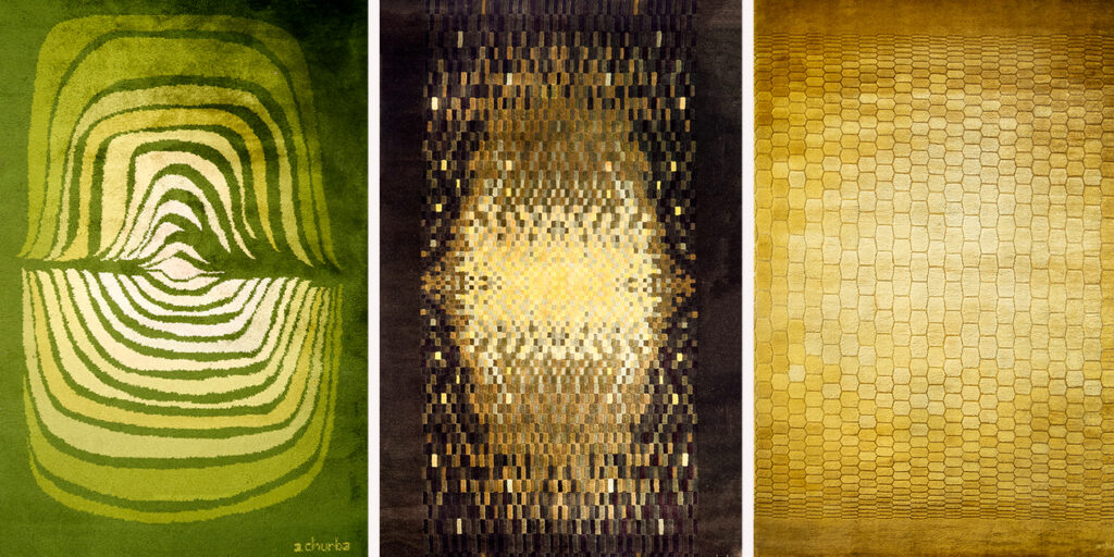 “Desde los años 60, Churba desarrolla una obra que explora múltiples soportes —mobiliario, alfombras, textiles y cristales— con igual profundidad técnica y estética. Sus alfombras vibran como superficies ópticas”, comentan los curadores Sandra T. Hillar y Wustavo Quiroga. Piezas de la Colección Satsch Gallery. Gentileza: Satsch Gallery.