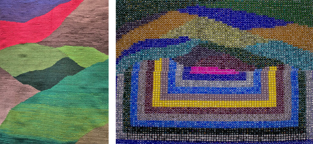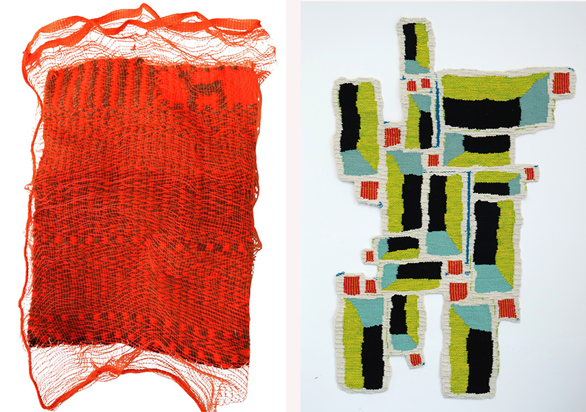 Izq: Victoria Pastrana, ganadora reciente del Primer Premio de Escultura en el Salón Nacional, transforma bolsas de cebolla y un pelero ecuestre en potentes obras textiles que dialogan con su identidad como integrante de la comunidad indígena de Amaicha del Valle (Tucumán)., Gentileza Otto. Der: Guido Yannitto, tapices que exploran sus posibilidades materiales y profundizan en los aspectos escultóricos de esta técnica planimétrica. Gentileza Guido Yanitto.