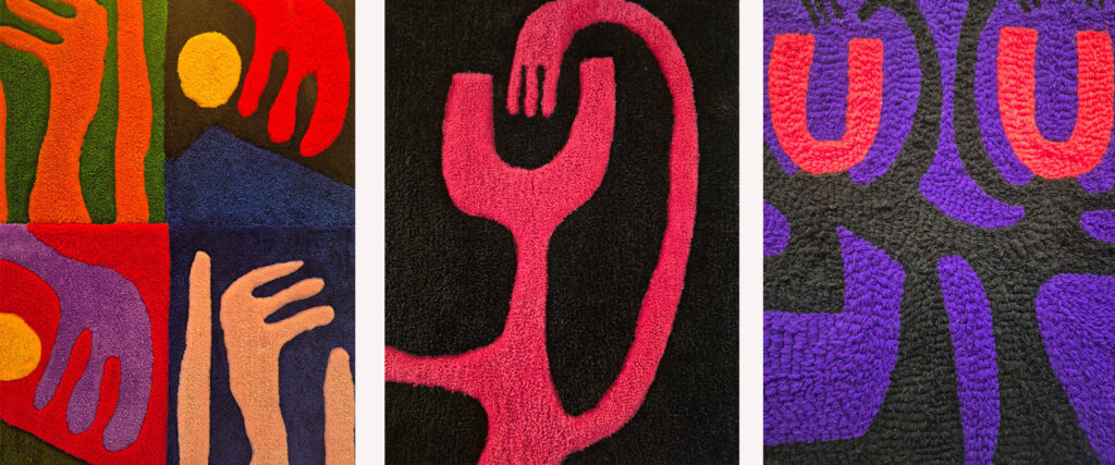 La salteña Victoria Michel (tataranieta de Cándido López) exhibió, en el espacio de la Galería Gascón, textiles en lana acrílica (un material atractivo que no puede ser dañado por polillas o insectos), que funcionan como pintura tejida. Colores saturados, volúmenes y técnicas mixtas (tanto a máquina como manuales) construyen imágenes que evocan la memoria ancestral y su propio imaginario. “Mis piezas nacen de las sombras que habito. Las confronto, no para eliminarlas, sino para entenderlas y vestirlas de color”, señala la artista. Y añade: “El textil se convierte en el lienzo donde plasmo la belleza de lo complejo. Las siluetas que emergen poseen un dejo orgánico y autóctono, reflejando una territorialidad que me atraviesa. Los contornos tienen movimiento, están inquietos y llenos de vida. Mi trabajo es la prueba de que la luz y la oscuridad, lejos de anularse, se entrelazan y se fusionan, dando como resultado siluetas cargadas con la energía de lo que he sido y lo que soy”.
