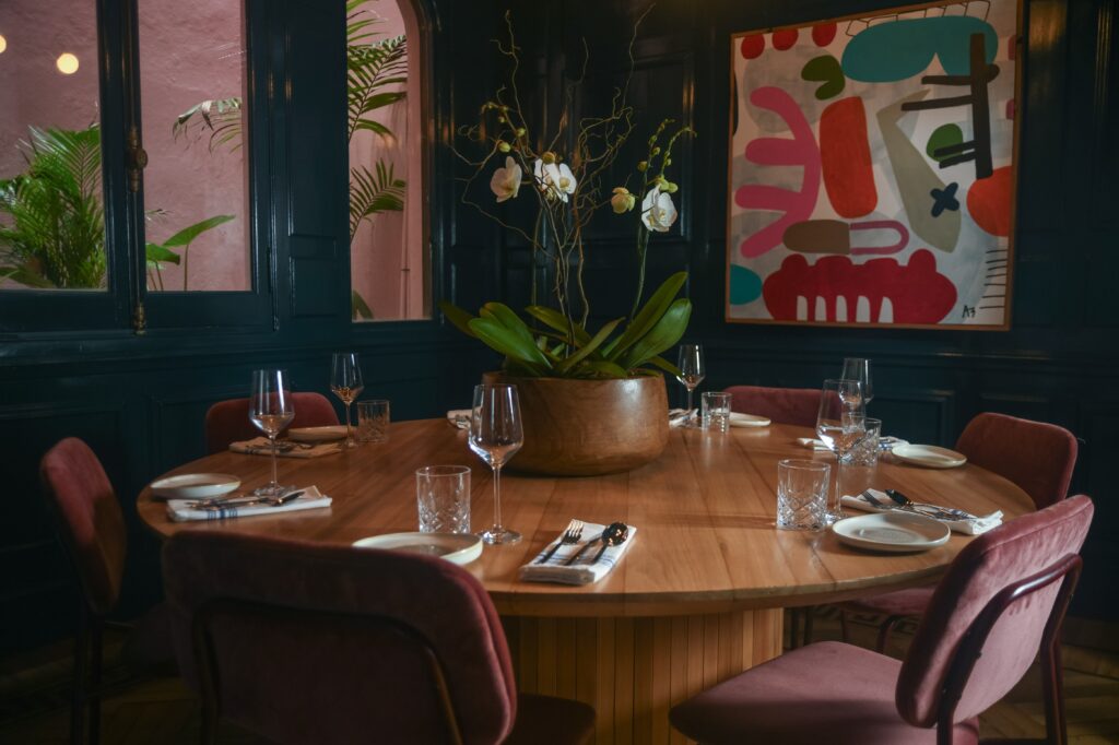 Otros materiales refuerzan el planteo artístico, como los troncos recolectados en los montes de Córdoba que sometieron a un proceso de secado al aire libre y fueron curados al fuego. Este objeto escultórico está suspendido del techo y acompaña a las puertas de vidrios biselados y las pinoteas recuperadas. Además, los platos se sirven en cuencos de madera, cerámica y tablas de piedra.