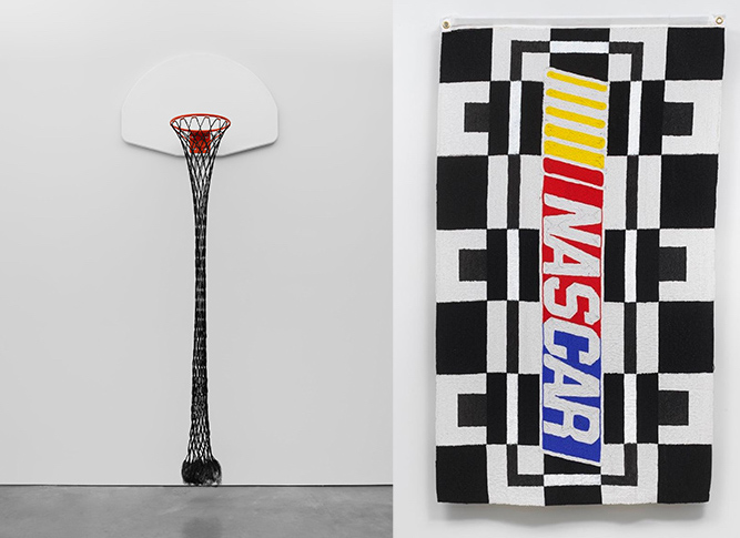 Izquierda:Hugh Hayden. Nubian Queen, 2022. Cabello sintético, aro de básquet y tablero. Colección del Pérez Art Museum Miami, adquirido por el museo con fondos provistos por el Collectors Council de PAMM. Foto © Hugh Hayden; Cortesía Lisson Gallery./ Derecha: Sam Fresquez, NASCAR Nation, 2022; gentileza de la artista y Lisa Sette Gallery, Phoenix, AZ; Foto © Sam Fresquez; gentileza de la artista.