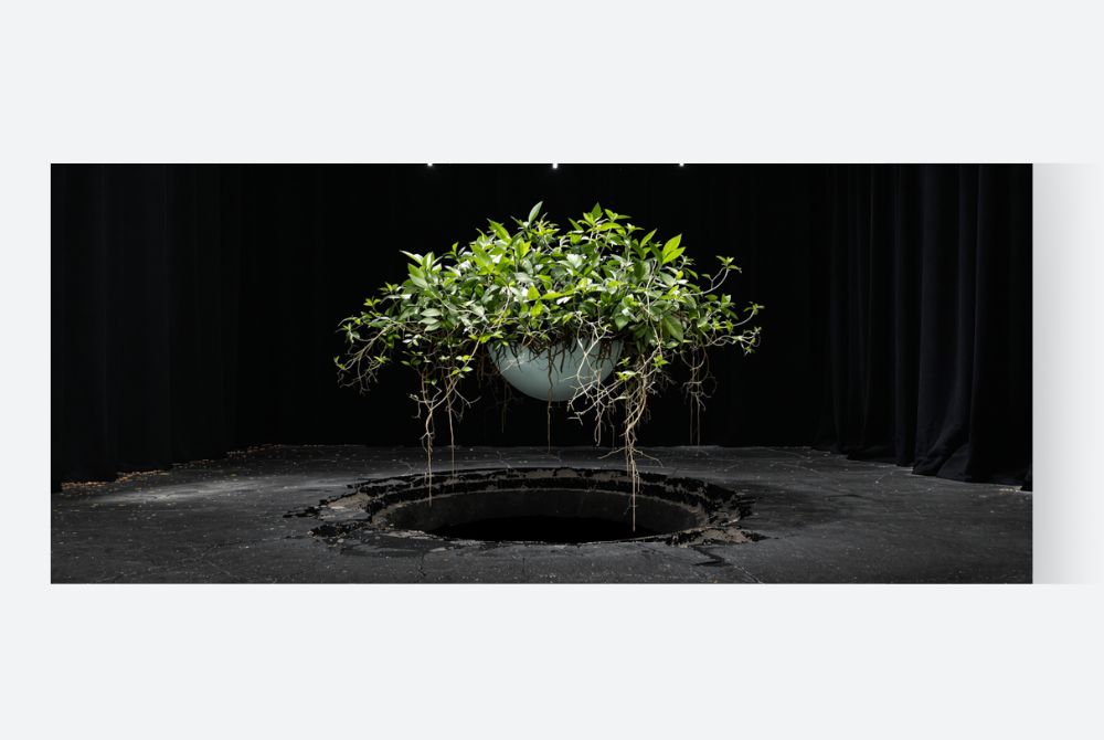 La tensión entre lo natural y lo artificial se despliega en un paisaje suspendido entre el abandono y la regeneración. Raíces y cables emergen del suelo como vestigios de un sistema en transformación, mientras una bioescultura flotante desafía la gravedad, fusionando materia orgánica y tecnología en una nueva entidad incierta.