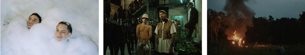 Algunos de los videos en los que se destacó como directora de arte. Izquierda: ¨Baño María“ Ca7riel & Paco Amoroso, dir. Pantera, prod. Obra,. “En este caso particular, muchas de las fotos que saqué se terminaron usando en el BTS para toda la promo del disco. Estuve en la presentación en el Lollapalooza y en otras instancias”, recuerda Valentina. Centro: Trueno ft. J Balvin, dir. Lucas Vignales. Derecha: Ateph Elidja, “Burn October” Dir: Wacho, Prod Pantera. Gentileza Valentina Luppino