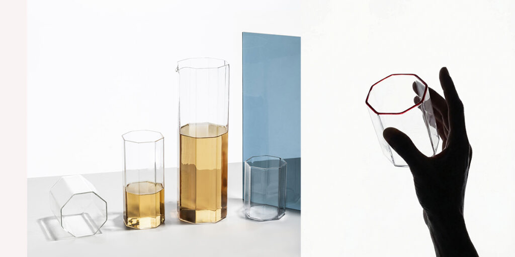 Octave, para Ichendorf (2026), es una colección de recipientes de vidrio facetados. Su nombre hace referencia de manera más obvia a la geometría del objeto, y de forma subyacente trabaja sobre la progresión de octavas usadas en música para definir al intervalo entre las diferentes medidas de los recipientes que componen la colección. Ph: Giovanni E. Galanello