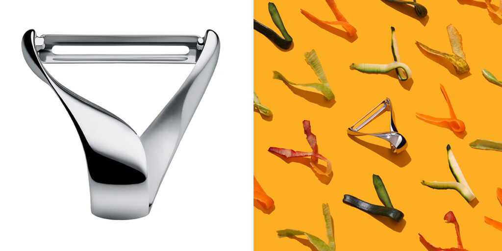 Sufrido, pelador de frutas y verduras, para Alessi (2015), el tamaño compacto busca acortar la distancia entre el alimento y la mano. Asistente de proyecto: Pedro Rodriguez. Ph: Bea de Giacomo