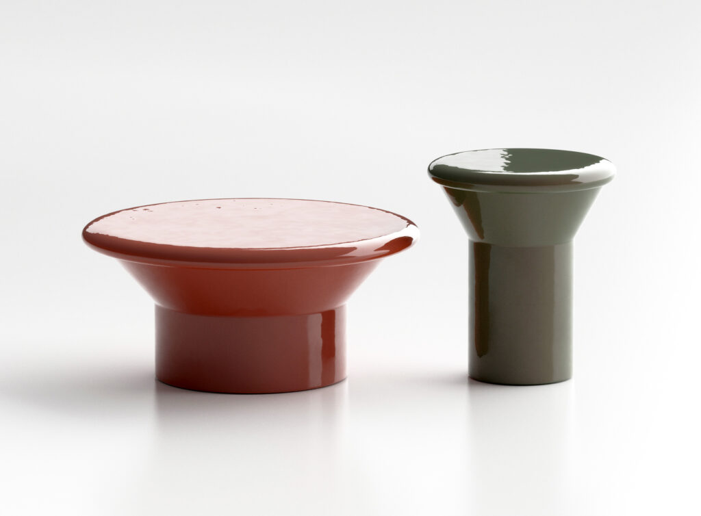 Tama, para Ethimo. Colección de mesas (Ø39 y Ø70) bajas en cerámica de fabricación artesanal.
